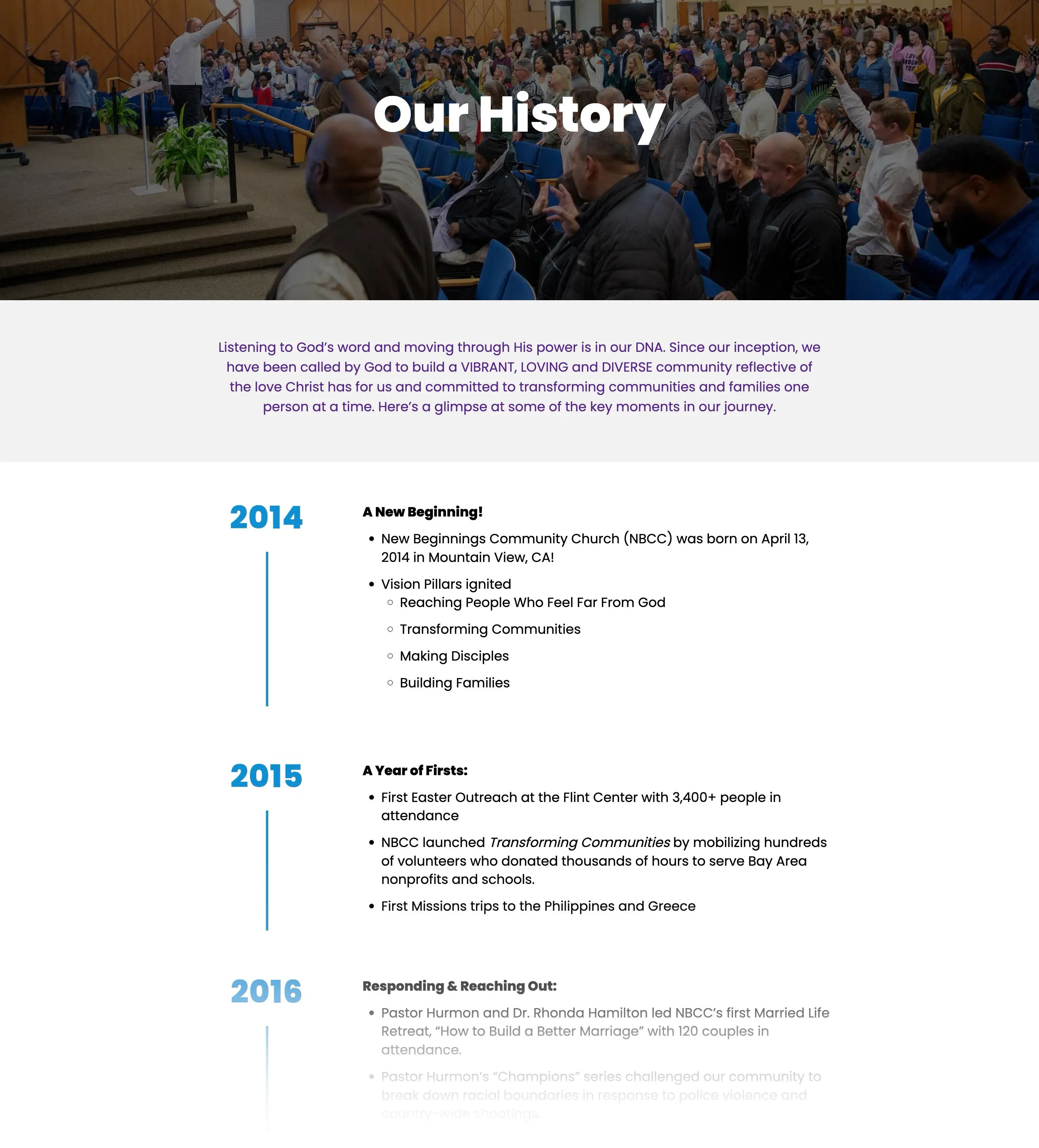 New Beginnings Community Church (NBCC) is a vibrant, diverse Christ-centered community located in the heart of San Francisco's Bay Area. Their mission is to help anyone who believes in God believe in church again, creating a safe, welcoming place where people from all backgrounds can explore faith, ask questions, and grow.